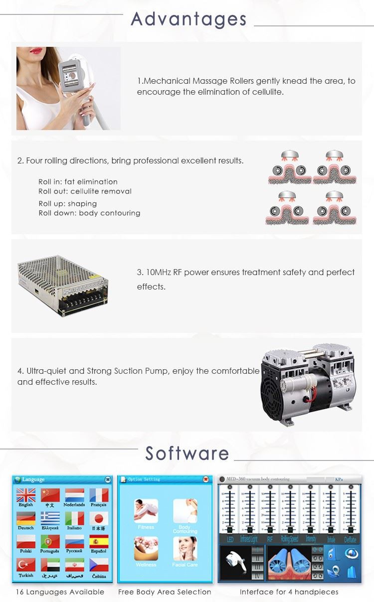 Med-360 Body Reshape Body Salming Machine 4 erinevat käepidet, mida kasutatakse erinevate kehaosade jaoks 5-ühes kombineeritud vaakum + RF +Rull +IR+ Led Eye Keha Käe/jalg nägu /NeckWhole kehahooldus annab tervislikul viisil täiusliku figuuri